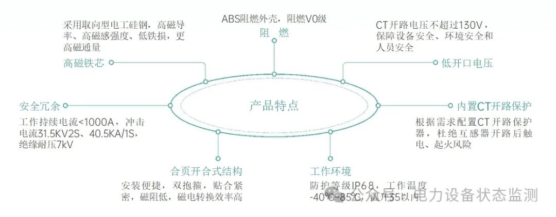取電互感器采用IP68級(jí)防水、鐵芯納米層防銹及V0級(jí)阻燃設(shè)計(jì),內(nèi)置專業(yè)型開路保護(hù)器(保護(hù)啟動(dòng)后電壓有效值Vrms<2V),大電流容量設(shè)計(jì)讓額定滿載電流時(shí)溫升≤35℃,保障了現(xiàn)場(chǎng)的安全便捷安裝及長(zhǎng)期無(wú)憂的安全穩(wěn)定運(yùn)行。