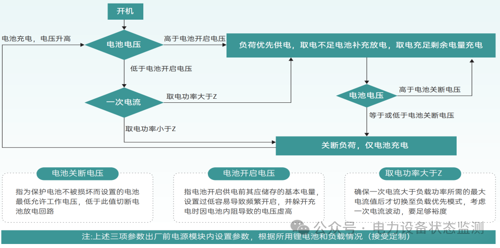 因供電負(fù)荷的變化線纜電流波動(dòng)很大,在一次電流過(guò)低時(shí)甚至無(wú)法帶動(dòng)負(fù)載正常工作,因此電流感應(yīng)取電大多配置儲(chǔ)能電池,大電流時(shí)電池儲(chǔ)能,小電流時(shí)電池放電,以實(shí)現(xiàn)用電負(fù)載最大的在線工作率,且設(shè)備均戶外安裝運(yùn)行環(huán)境惡劣,在一次電流寬幅波動(dòng)情況下的專業(yè)電池充放電控制和管理尤為重要,好的設(shè)計(jì)不僅能提升設(shè)備在線率,延長(zhǎng)電池壽命,降低電池失效或故障起火的風(fēng)險(xiǎn),且還會(huì)避免負(fù)載頻繁重啟的打嗝現(xiàn)象。推薦奧博爾公司的下述充放電控制邏輯。
