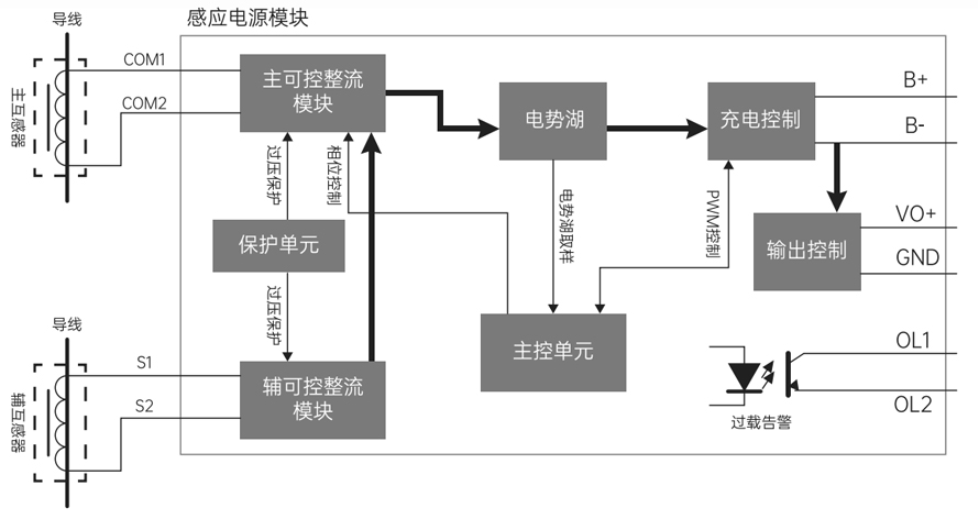 AP電流感應電源模塊根據(jù)高壓電力電纜、大電流母線及中低壓惡劣環(huán)境的電流感應取電需求設計,滿足嚴苛的防潮、防腐蝕和高低溫要求,輸入電流范圍寬并具有超強的耐短路電流沖擊能力,采用雙路CT輸入以增強一次電流較小時的應用場景,輸出功率為20W(50W以內可定制)。感應電源采用全狀態(tài)靜音可控整流技術,靜音控制最小占空比低于2%,靜音時不降低取電效率,在持續(xù)大電流空載和小電流滿載工況下,取電互感器均可較好的處于靜音工作狀態(tài),電源變換采用了隔離型DCDC變換技術,很好的保障了極端大電流沖擊時感應電源模塊和負載的安全。AP感應電源還將一次電流波動、電池充放電控制和負荷管理進行一體化智能設計,大電流時負載優(yōu)先,小電流且儲能不足時儲能優(yōu)先,既減小了一次電流不穩(wěn)定負載的頻繁啟停,又匯集了小電流時的點滴能源,有效地提升了設備的在線運行時間,并采用專業(yè)的鋰電池恒流-恒壓充電和放電保護策略,可有效的保障儲能鋰電池的使用壽命,實現(xiàn)了電流感應電源整個用電系統(tǒng)的一次性智能化管理,適應于包括電網(wǎng)、鐵路和新能源等各類戶外電流感應取電場景。