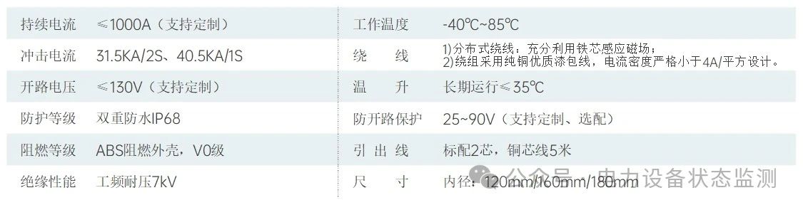 取電互感器采用IP68級(jí)防水、鐵芯納米層防銹及V0級(jí)阻燃設(shè)計(jì),內(nèi)置專業(yè)型開路保護(hù)器(保護(hù)啟動(dòng)后電壓有效值Vrms<2V),大電流容量設(shè)計(jì)讓額定滿載電流時(shí)溫升≤35℃,保障了現(xiàn)場(chǎng)的安全便捷安裝及長(zhǎng)期無(wú)憂的安全穩(wěn)定運(yùn)行。