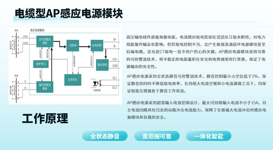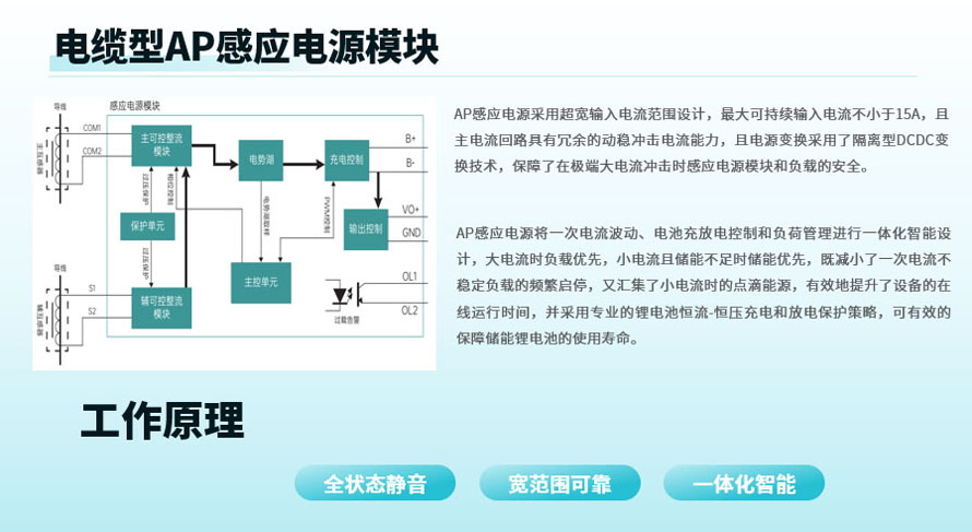 AP電流感應電源模塊根據(jù)高壓電力電纜、大電流母線及中低壓惡劣環(huán)境的電流感應取電需求設計,滿足嚴苛的防潮、防腐蝕和高低溫要求,輸入電流范圍寬并具有超強的耐短路電流沖擊能力,采用雙路CT輸入以增強一次電流較小時的應用場景,輸出功率為20W(50W以內可定制)。感應電源采用全狀態(tài)靜音可控整流技術,靜音控制最小占空比低于2%,靜音時不降低取電效率,在持續(xù)大電流空載和小電流滿載工況下,取電互感器均可較好的處于靜音工作狀態(tài),電源變換采用了隔離型DCDC變換技術,很好的保障了極端大電流沖擊時感應電源模塊和負載的安全。AP感應電源還將一次電流波動、電池充放電控制和負荷管理進行一體化智能設計,大電流時負載優(yōu)先,小電流且儲能不足時儲能優(yōu)先,既減小了一次電流不穩(wěn)定負載的頻繁啟停,又匯集了小電流時的點滴能源,有效地提升了設備的在線運行時間,并采用專業(yè)的鋰電池恒流-恒壓充電和放電保護策略,可有效的保障儲能鋰電池的使用壽命,實現(xiàn)了電流感應電源整個用電系統(tǒng)的一次性智能化管理,適應于包括電網(wǎng)、鐵路和新能源等各類戶外電流感應取電場景。